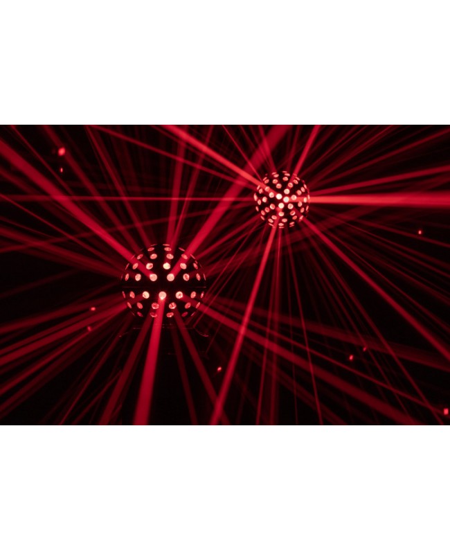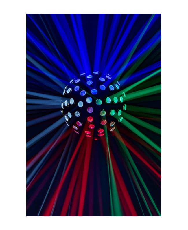 Der Showtec Colourburst PRO ist ein leistungsstarker RGBW-Spiegeleffekt. Er bietet volle Kontrolle über alle Farben in 5 Sektionen und eine unendliche bidirektionale Rotation über DMX, manuell, Master/Slave oder Standalone-Betrieb. Er verfügt über 2-Grad-Lichtstrahlen und eine 360°-Abdeckung mit 98 Linsen/Strahlen, um romantische Atmosphären und dynamische Disco-Effekte zu erzeugen. Die integrierten Programme und Effekte können im Musik-, Automatik- und DMX-Modus angewendet werden. Er verfügt über ein OLED-Display zur Steuerung und Einstellung der Parameter. Der Showtec Colourburst PRO kann auf jeder Oberfläche aufgestellt oder mit der mitgelieferten Quicklock-Hängevorrichtung aufgehängt werden. Es können mehrere Geräte über DMX- oder Power-Pro-Verbindungen miteinander verbunden werden.