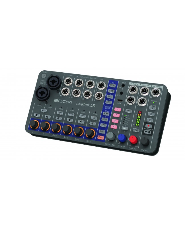 LiveTrak L6 is our most compact and portable digital mixer/recorder. With 10 studio-quality audio tracks, effects, MIDI and sound pads, it's perfect for bands, synth players, live streaming and much more.