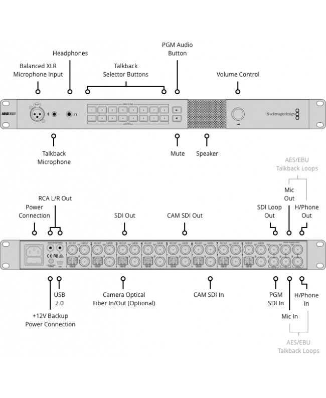 ATEM Talkback Converter 4K handles up to 8 cameras for SDI talkback using embedded audio channels 15 and 16 as used on the Blackmagic Studio Cameras and ATEM Camera Converter. Supports 12G-SDI for all SD, HD and Ultra HD formats up to 2160p60 and provides BNC connections to each camera, and an optical fiber socket for adding an optical fiber SFP module for extending camera distances when required. Includes push to talk buttons, support for tough and common aviation headsets, loop through for more than 8 camera support, built in speaker, front panel mic input and much more.