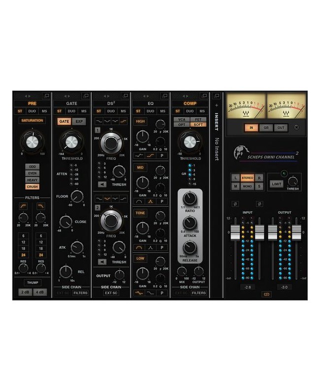 Scheps Omni 2 is now more versatile than ever, with exciting new features added: CRUSH, a new preamp saturation flavor that can be driven to aggressive distortion. SOFT, a new soft-knee compressor, in addition to the Omni’s VCA, FET, and OPT. A new 24dB-per-octave filter with serious resonance, great for creative effects. Plus the ability to add VST3 plugins by any brand in the Omni’s insert point.
